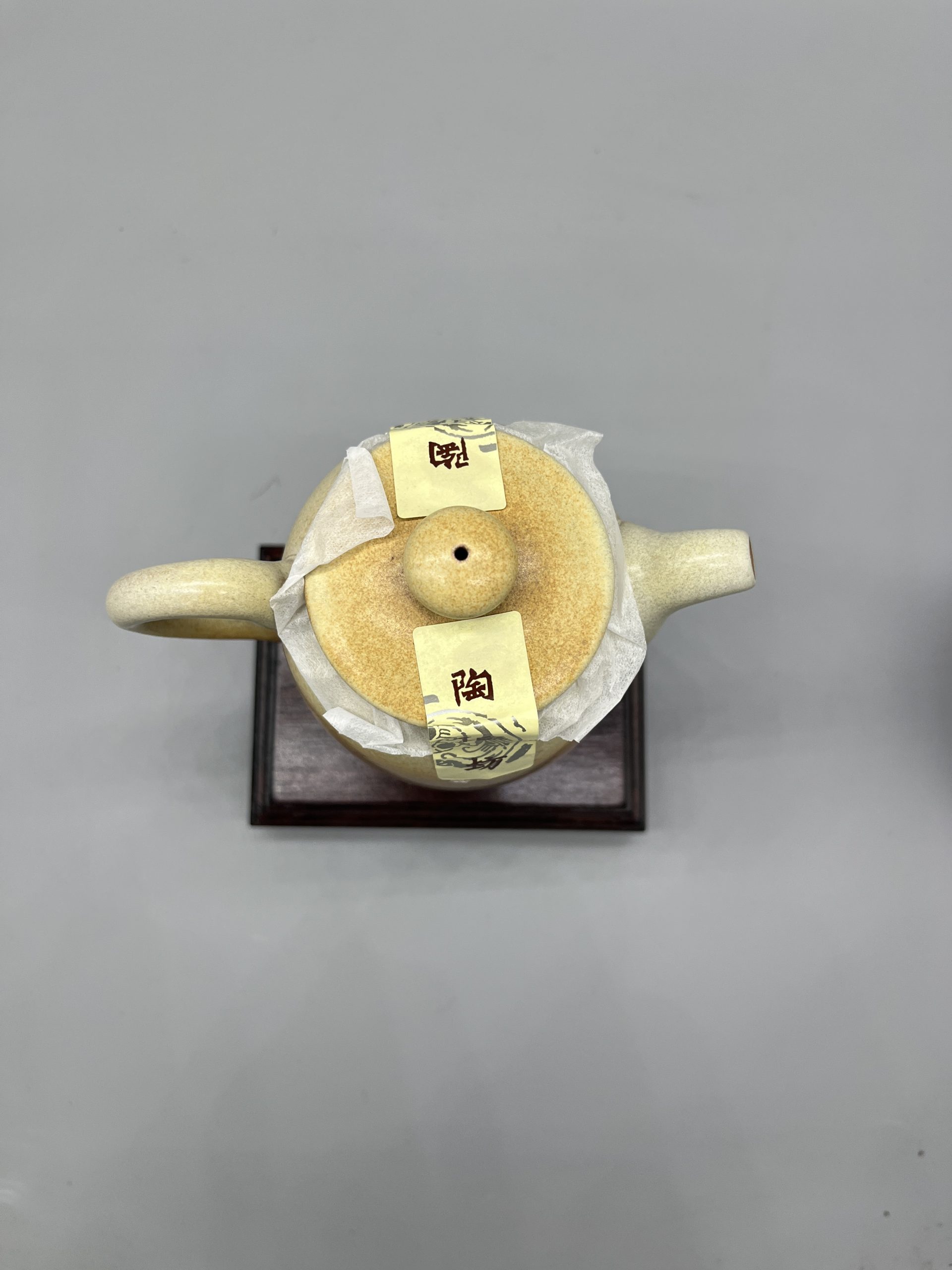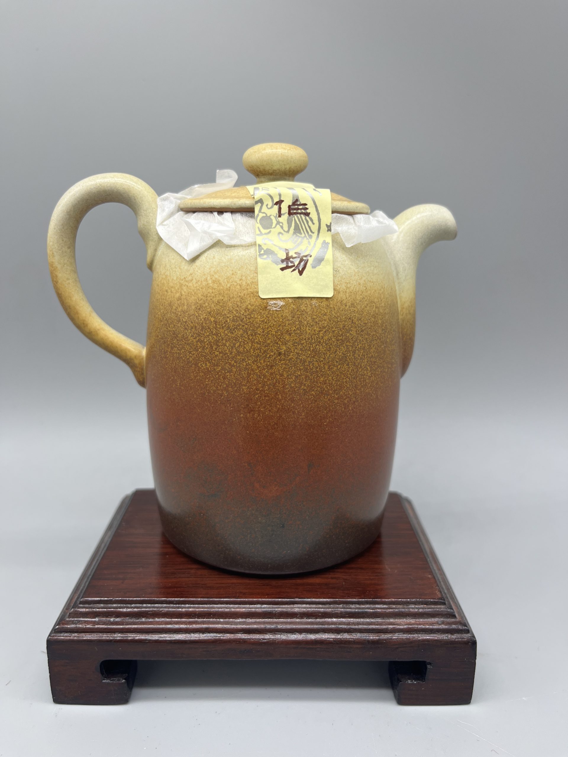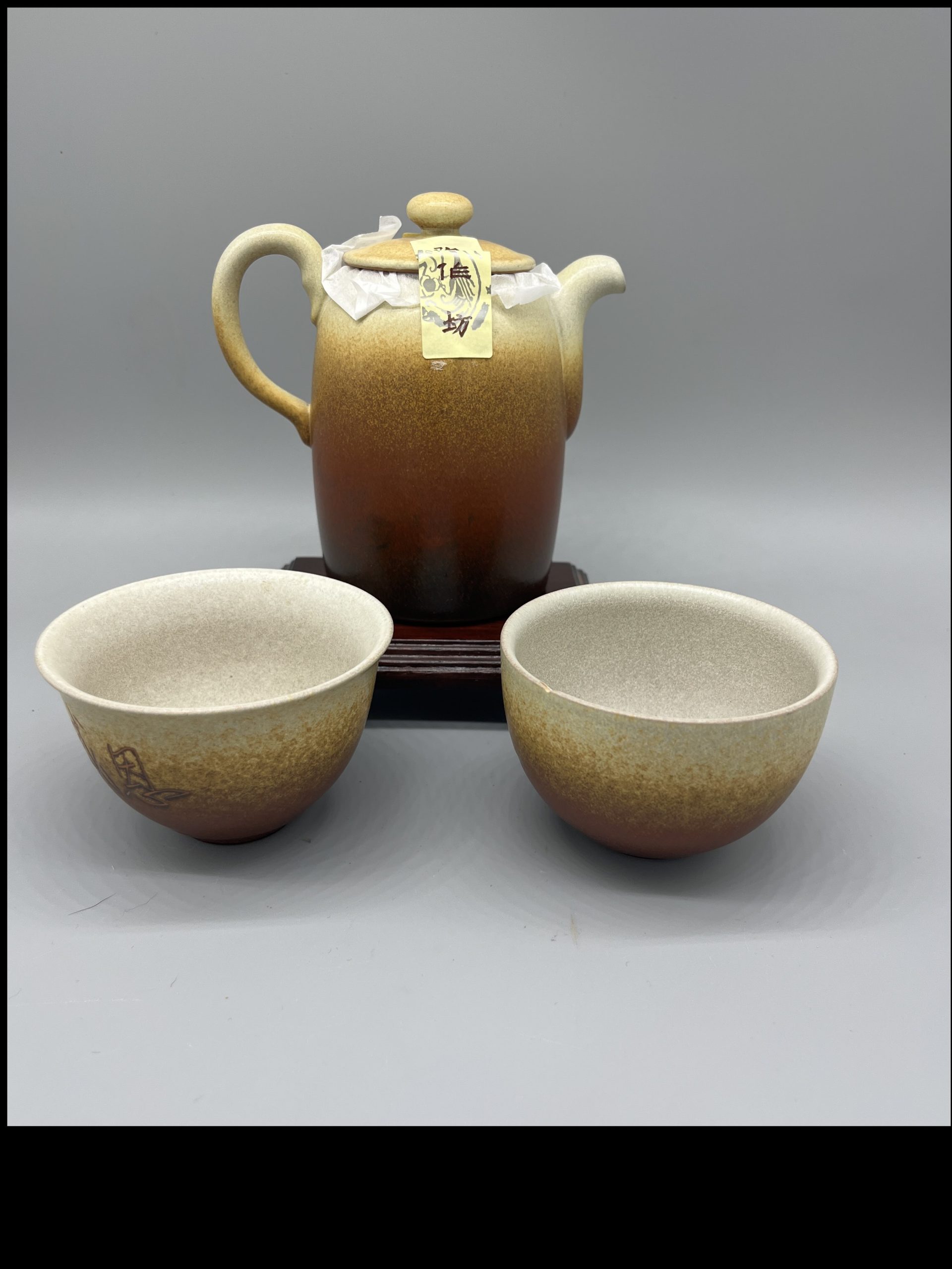 A three-piece ceramic tea set by Lin’s Ceramic Studio, presented in a gift box. It features an elongated teapot design, finished in earthy brown and white tones.